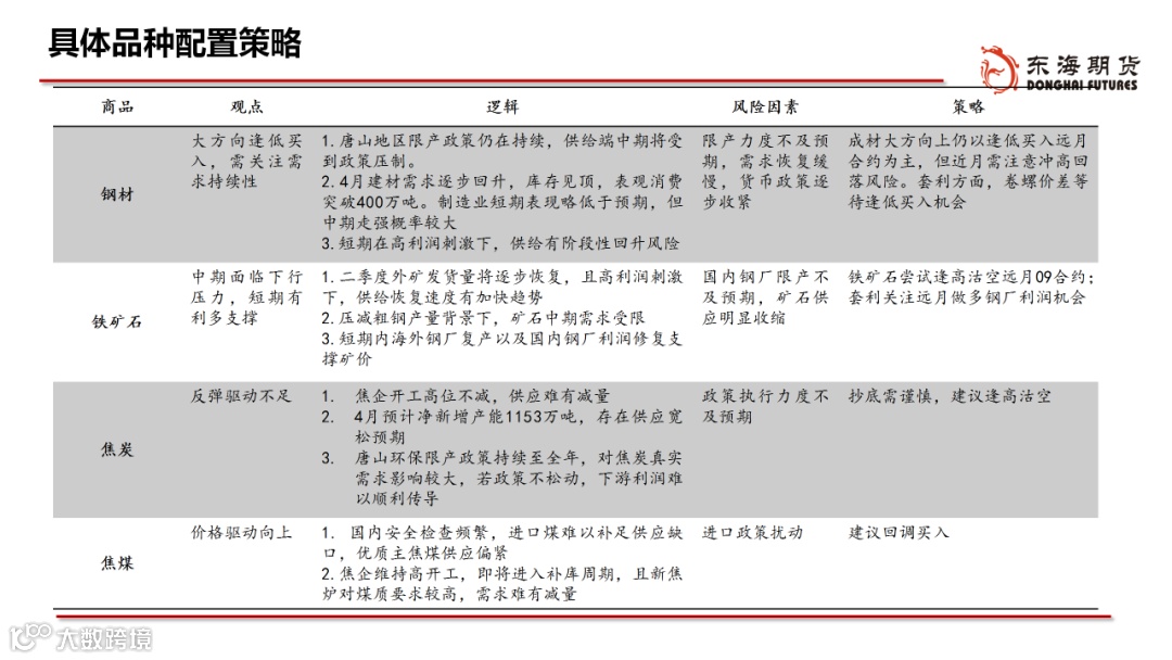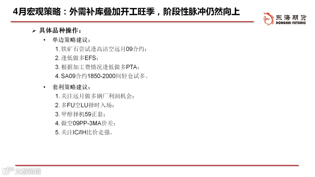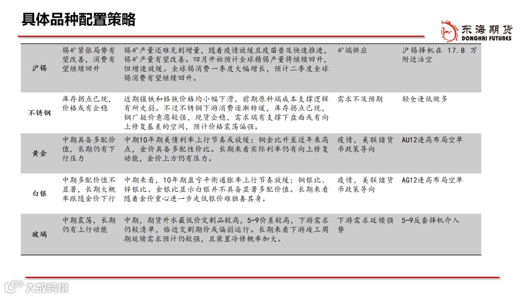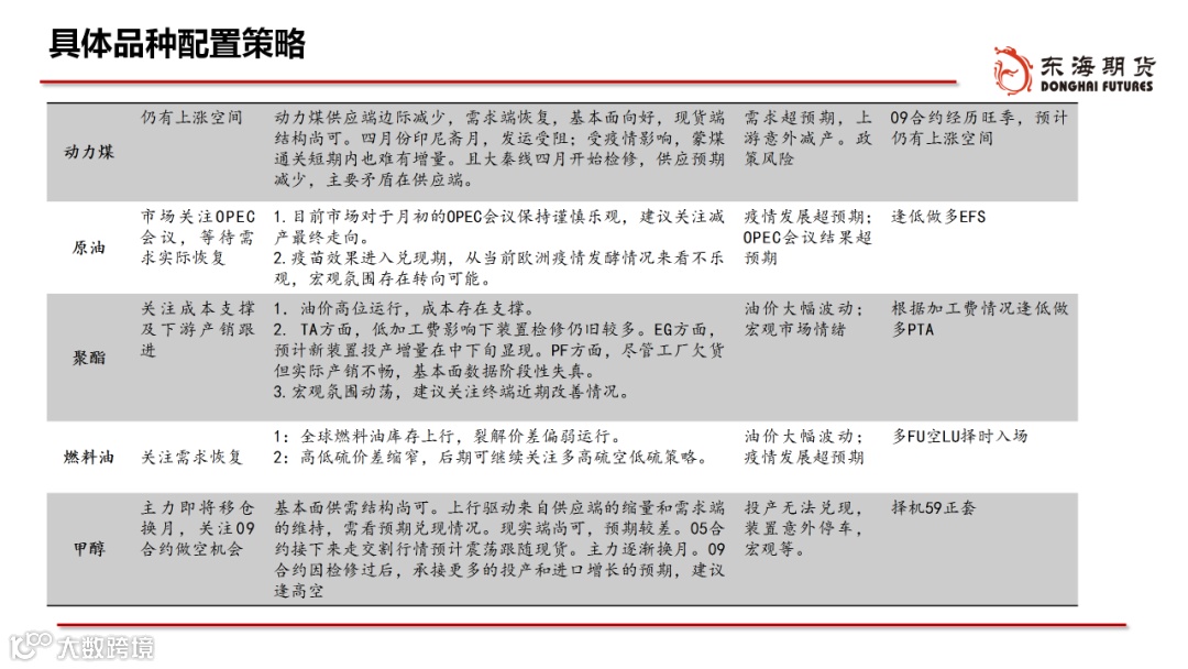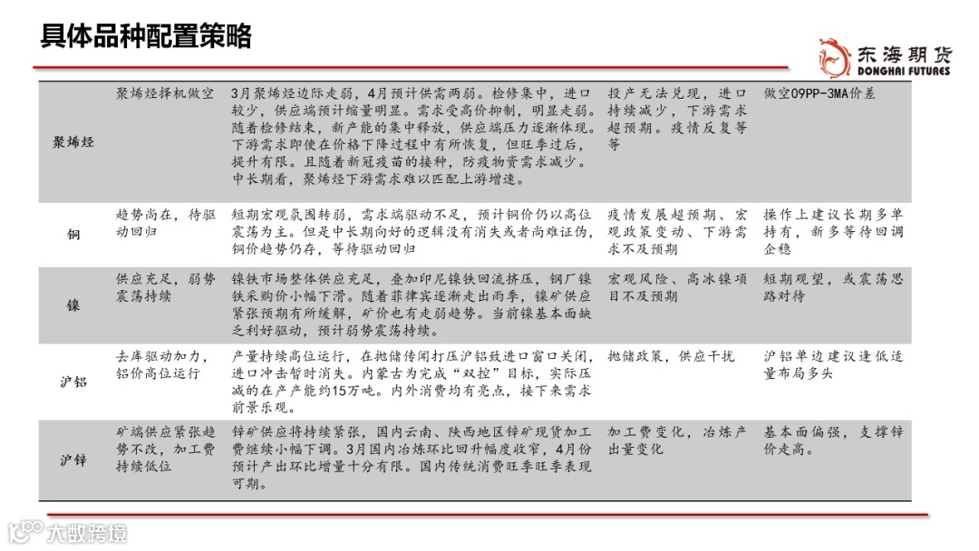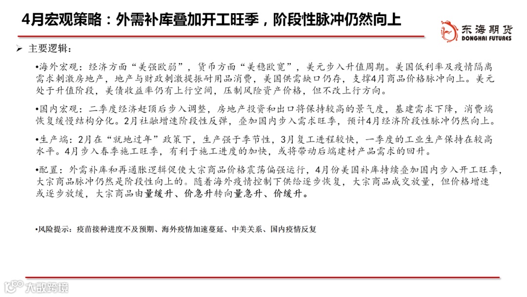 ◆配置:外需补库和再通胀逻辑促使大宗商品价格震荡偏强运行,4月份美国补库持续叠加国内步入开工旺季,大宗商品脉冲仍然是阶段性向上的。随着海外疫情控制下供给逐步恢复,大宗商品成交放量,但价格增速或逐步放缓,大宗商品由量缓升、价急升转向量急升、价缓升。