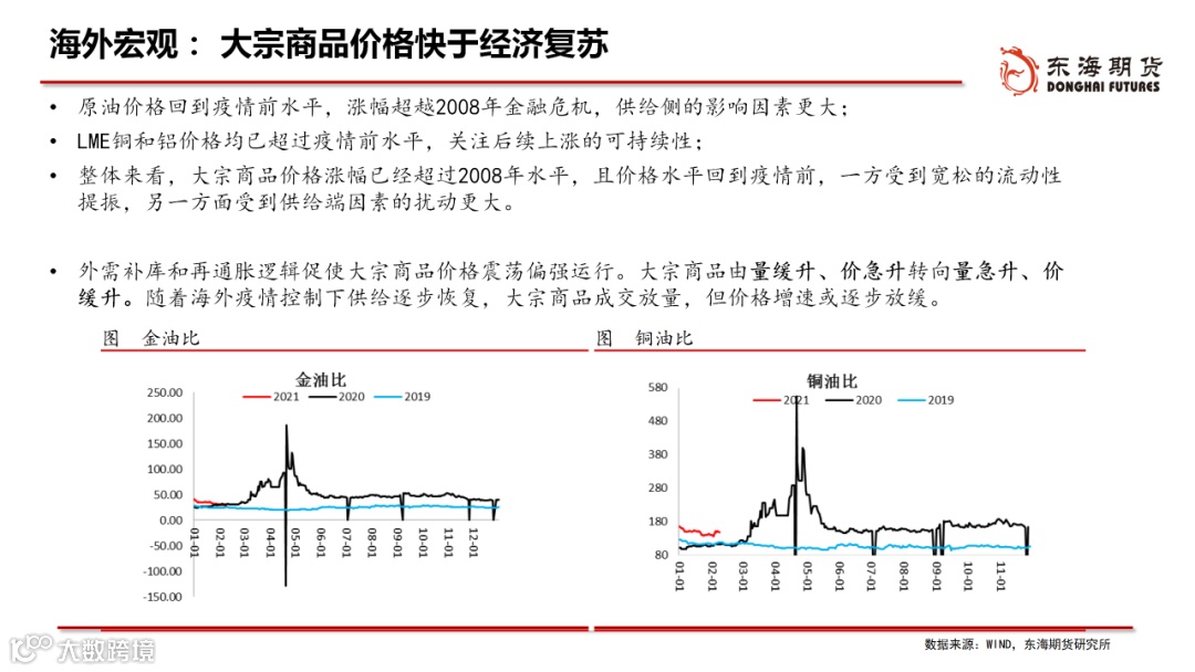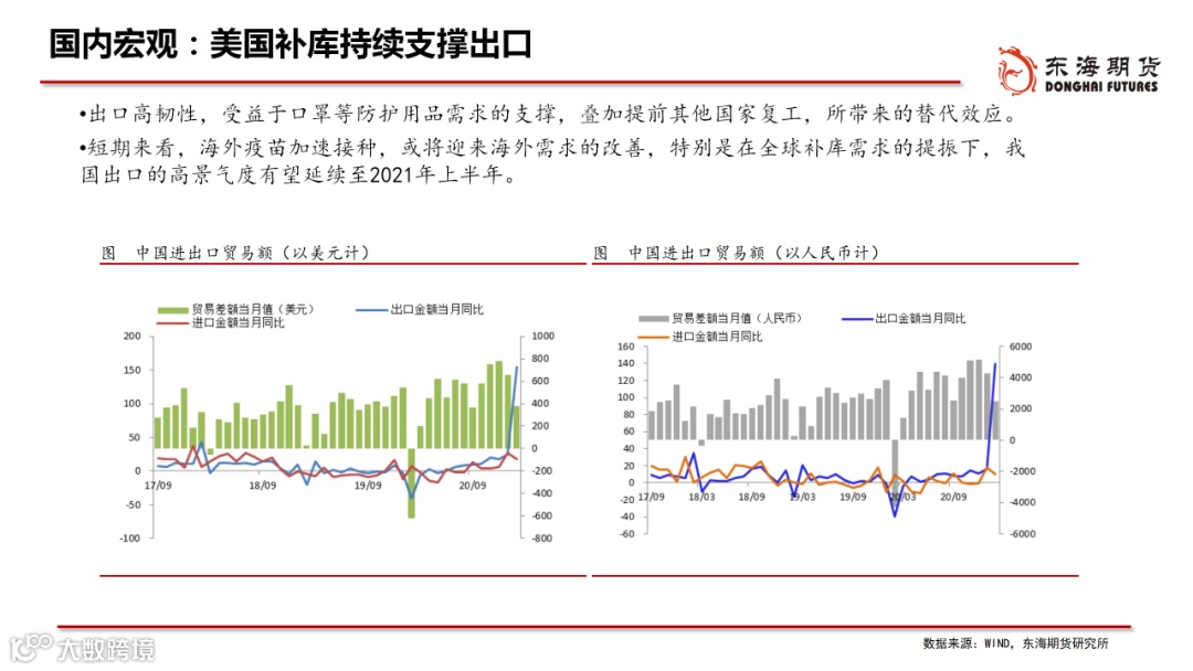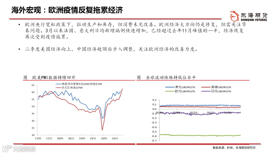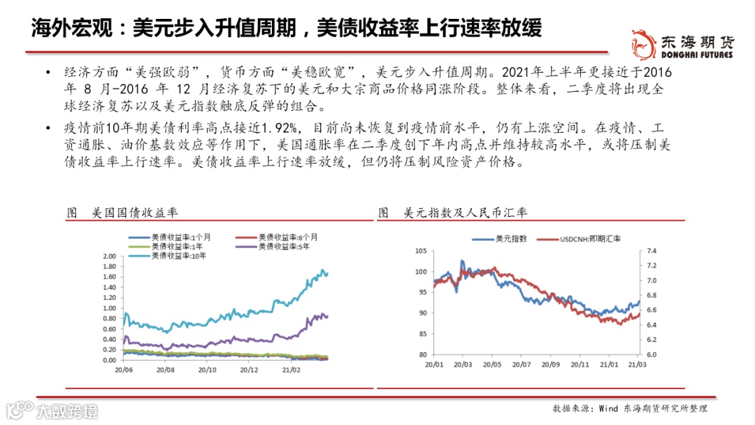◆海外宏观:经济方面“美强欧弱”,货币方面“美稳欧宽”,美元步入升值周期。美国低利率及疫情隔离需求刺激房地产,地产与财政刺激提振耐用品消费,美国供需缺口仍存,支撑4月商品价格脉冲向上。美元处于升值阶段,美债收益率仍有上行空间,压制风险资产价格,但不改上行方向。