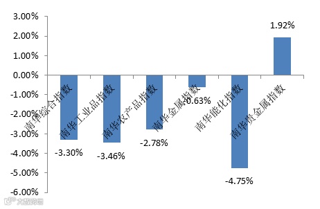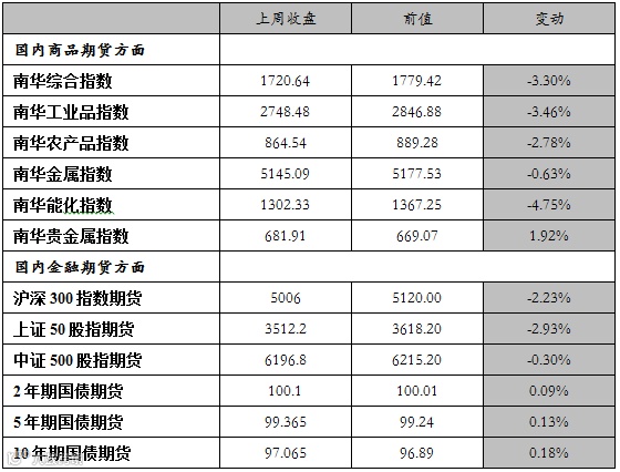 上周国内商品期货除贵金属板块延续下跌,股指期货持续下跌,国债期货小幅上涨。