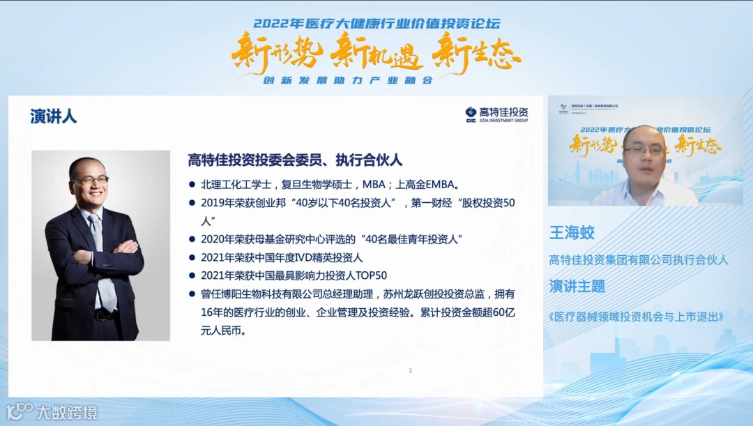 这两年,疫情的爆发也大大促进了市场对医疗器械的需求及重视程度,高特佳投资集团有限公司执行合伙人王海蛟针对医疗器械领域的投资上市展望和策略指出,行业竞争格局的重塑对企业的管理能力、研发创新能力、品质管控等都提出了更高的要求,这也必将有利于行业健康良好发展。