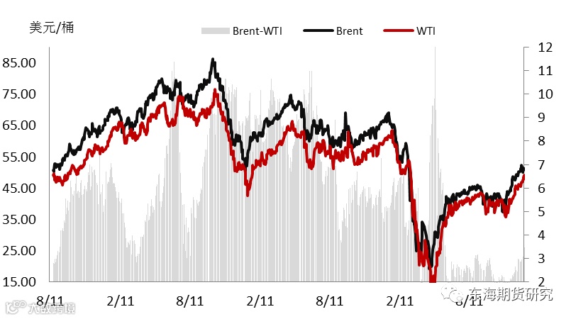 欧美疫情持续发酵。援引媒体消息,英国首相鲍里斯·约翰逊1月5日发表电视讲话,宣布英格兰全境实施最高级别严格管控措施,以阻断目前迅速蔓延的新冠病毒感染疫情。这是继伦敦封城之后,英国再次升级疫情防疫级别,事实上的实施封国。首相约翰逊宣布,为了帮助控制新冠病毒新毒株传播,包括零售、酒店和休闲旅游行业在内的营业场所将关闭到至少2月中旬。自英国传出变异毒株消息,欧洲其他国家一度切断了国际航班以防止疫情扩散,对航空煤油的消费严重不利。从当前成品油需求的角度分析,我们认为消费复苏水平上讲柴油>汽油>航煤。尽管近期裂解价差相对走强,但疫情的拖尾效应对于航空业仍旧形成负面影响。从库存角度看,美国石油学会发布的数据显示,截止12月25日当周,美国汽油库存增加547.3万桶,馏分油库存增加713.6万桶,换言之,当前全球成品油仍旧处于累库趋势中。从Brent-WTI的价差中我们也不难看出,尽管2021年复苏是主基调,但目前欧洲方面整体原油消费仍未发力。