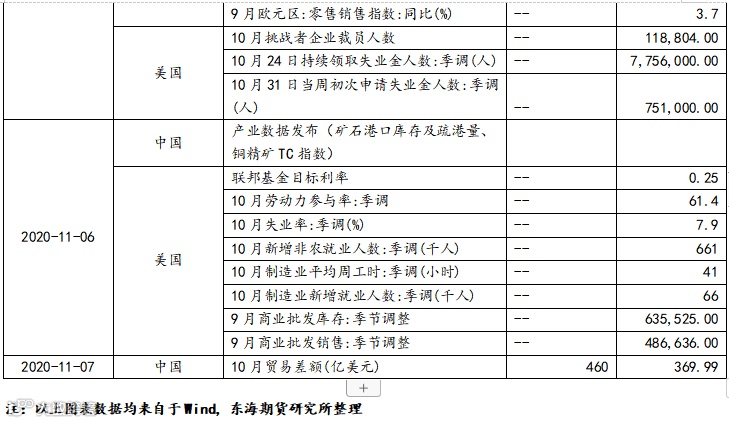 5. 11月6日(周五):产业数据发布(矿石港口库存及疏港量、铜精矿TC指数)、11月美联储公布利率决议、美国10月失业率、美国10月新增非农就业人数