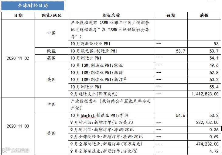 1. 11月2日(周一):产业数据发布(SMM公布“中国主流消费地电解铝库存”及“SMM七地锌锭社会库存”)、中国10月财新制造业PMI、欧元区10月制造业PMI、美国10月制造业PMI