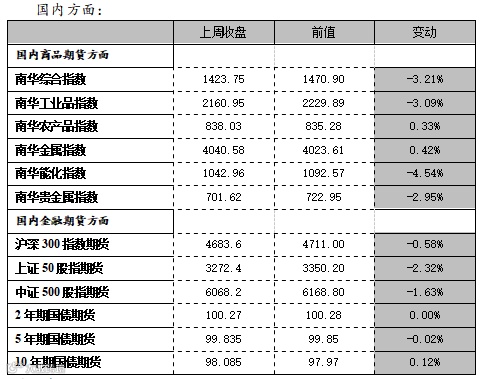 上周国内商品板块涨跌互现,股指期货持续走低,国债期货走势平稳。