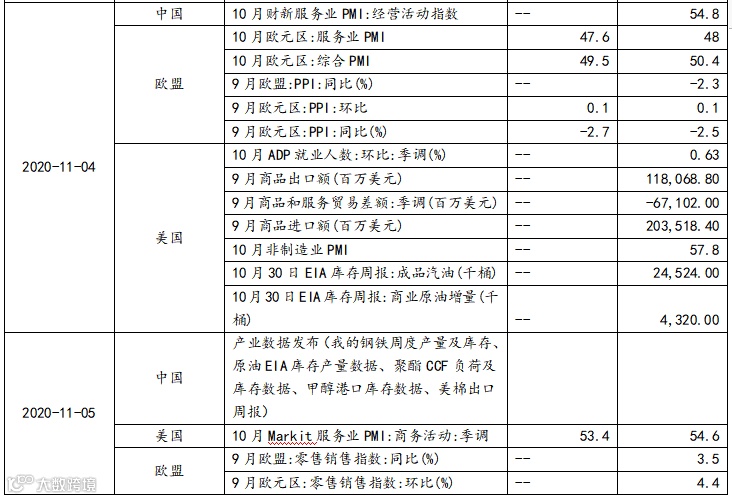 4. 11月5日(周四):产业数据发布(我的钢铁周度产量及库存、原油EIA库存产量数据、聚酯CCF负荷及库存数据、甲醇港口库存数据、美棉出口周报)、美国10月31日当周初次申请失业金人数