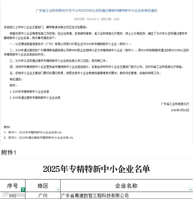 2月10日,广东省工业和信息化厅正式公布2025年专精特新中小企业名单,省建院下属广东省粤建数智工程科技有限公司(以下简称“粤建数智”)凭借在工程建设数字化领域的技术积淀与创新突破,成功入选专精特新中小企业。