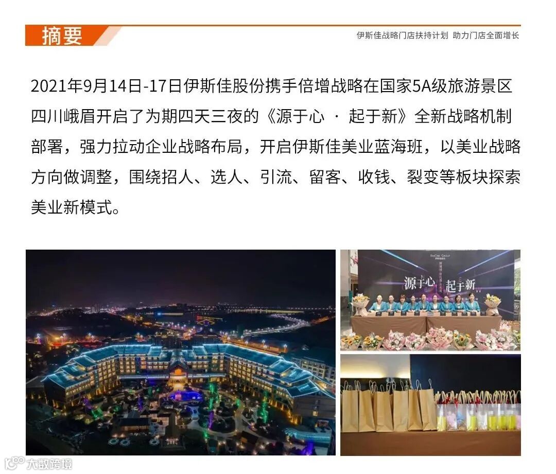 导读:2021年9月14日-17日伊斯佳股份携手倍增战略在国家5A级旅游景区四川峨眉开启了为期四天三夜的《源于心 · 起于新》全新战略机制部署,强力拉动企业战略布局,开启伊斯佳美业蓝海班,以美业战略方向