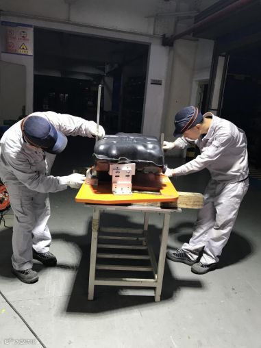 一工厂241-2机在吹塑P84油箱产品时,从削边台到冷却站距离6米左右,削边工把修好的油箱手动送到冷却站来回12米,按照每班470只油箱定额计算,削边工每班行动距离5640米(约5.6公里)。看着这种距离远、劳动强度大、耗时长、油箱本体检验时间短的状况,一工厂设备管理室雷茂鹏、罗维斌、白顺3位小伙子动起了巧心思,能不能用增加工装的形式来减轻操作工的劳动强度,留出最大时间检验油箱本体、保障油箱质量?他们的想法很快得到了设备管理室张剑主管的支持,并且给他们支了一个小妙招:利用已经EOP产品的废旧工装进行改造,变废为宝,节约成本。同时,和主机机械手臂进行连接,实现自动化冷却,提高工作效率。把节余的时间留给操作工加强质检,保障油箱质量。