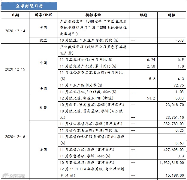 1. 12月14日(周一):产业数据发布(SMM公布“中国主流消费地电解铝库存”及“SMM七地锌锭社会库存”)