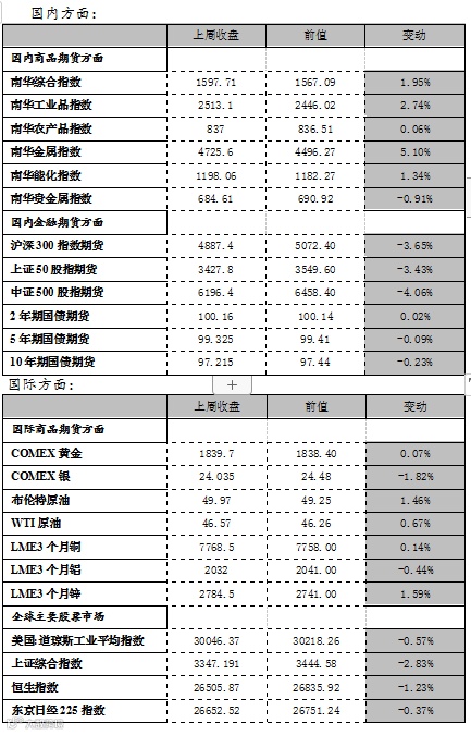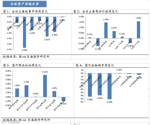 上周国内商品除贵金属板块外全部上涨,股指期货集体下跌,国债期货延续小幅回调。