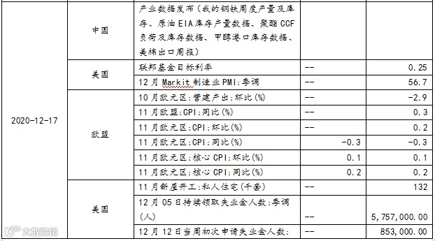 4. 12月17日(周四):产业数据发布(我的钢铁周度产量及库存、原油EIA库存产量数据、聚酯CCF负荷及库存数据、甲醇港口库存数据、美棉出口周报)、12月美联储公布利率决议、欧元区11月CPI、美国11月新屋开工、美国12月12日当周初次申请失业金人数