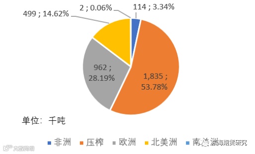 需求方面,全球花生消费量呈现逐年增加态势,其中压榨消费量历年基本保持在平稳水平,非压榨消费量呈现逐年上升态势。据USDA数据,2020年全球花生消费量为4758万吨,较2019年的4699万吨增加了1.26%,达历史最高水平。消费增加的主要原因是2020年美国和印度国内花生消费量出现明显增长。USDA数据显示,2020年全球花生压榨量为1890万吨,较2019年有所回落,但总体保持高位。非压榨消费为2868万吨,为历史峰值水平。