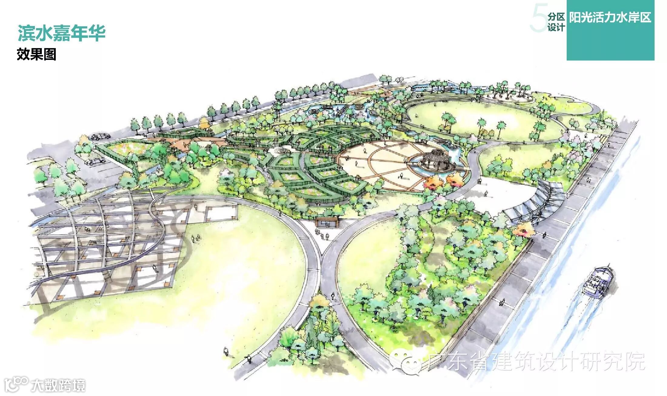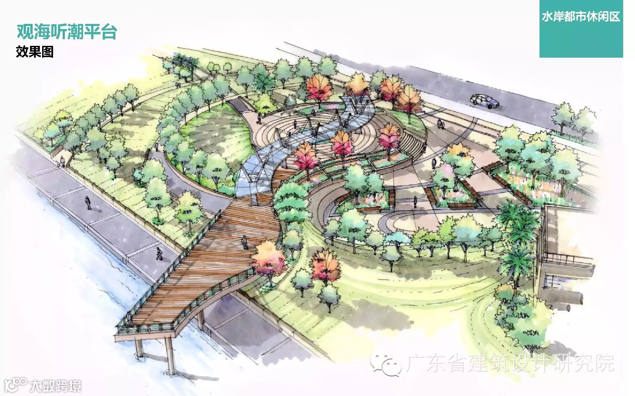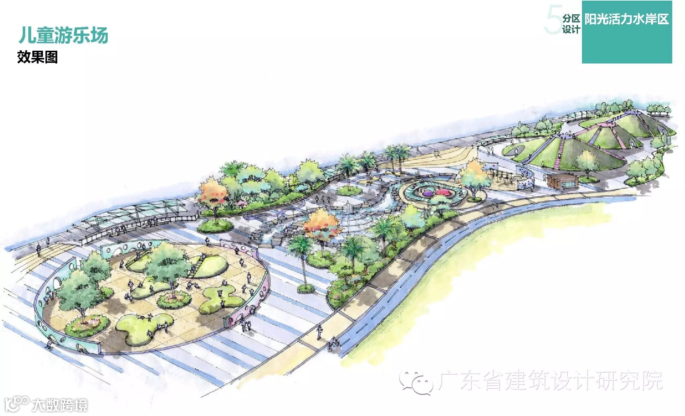 景观设计:滨水公园总体规划为阳光活力水岸区、水岸都市休闲区、岛尖创新展示区。