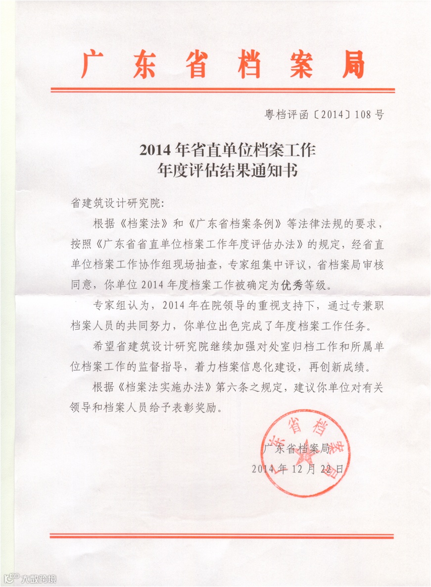 在我院领导的重视支持以及档案工作人员的努力下,我院在省档案局组织的2014年省直单位档案工作年度评估中被确定为优秀等次,特此祝贺。