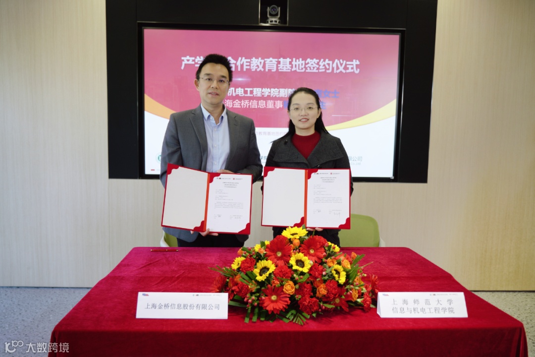 在与会嘉宾的共同见证下,金桥信息董事杨家骅先生与上师大信机学院副院长魏爽女士就此次基地落成正式签订了“产学合作教育基地协议书”。随后,信机学院党委副书记、副院长何佳先生、信机学院计算机科学与技术系主任洪璇女士、金桥信息董事兼财务总监颜桢芳女士、金桥信息AI创新中心业务总监冯健先生共同为产学研合作教育基地揭牌。