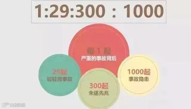1:29:300:1000,每一起严重的事故背后,必然有29起较轻微事故和300起未遂先兆,以及1000起事故隐患相随。对待事故,要举一反三,不能就事论事。任何事故的发生都不是偶然的,事故的背后必然存在大量的隐患、大量的不安全因素。