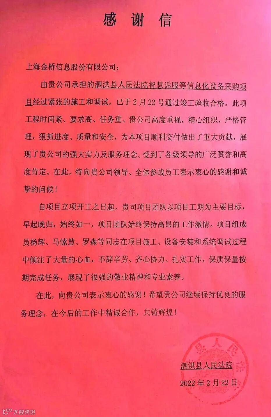 上海金桥信息股份有限公司充分借助现代信息技术,运用“互联网+”理念,积极助力泗洪法院推进智慧法院和现代化诉讼服务中心建设。为泗洪法院诉讼服务中心打造了“一站式”诉讼服务大厅,着力打造现代化诉讼服务体系,推动诉讼服务线上线下结合、端口与窗口对接,实现了网上信息技术服务与窗口传统服务的无缝对接,为当事人提供更加集中、高效的诉讼服务,不断提升人民群众的获得感、幸福感、安全感。