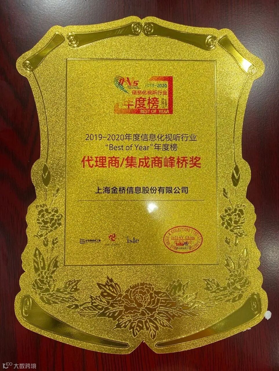 8月31日,“创新共赢 永葆活力”——2020信息化视听行业高峰论坛在深圳国际会展中心(宝安)盛大开幕,为焕发行业活力发声。探讨创新对于行业和企业的重要性;创新型企业的机会;教育科技创新的需求和实现。论坛发布了“2019信息化视听行业年度关键词TOP10”及“Best of Year年度榜单”。经过激烈的角逐,行业专家严格严格评审,上海金桥信息股份有限公司荣获2019-2020年度信息化视听行业“Best of Year年度榜单”代理商/集成商峰桥奖。这是对金桥包括产品研发实力、市场占有率、用户满意度等企业综合能力的高度认可。