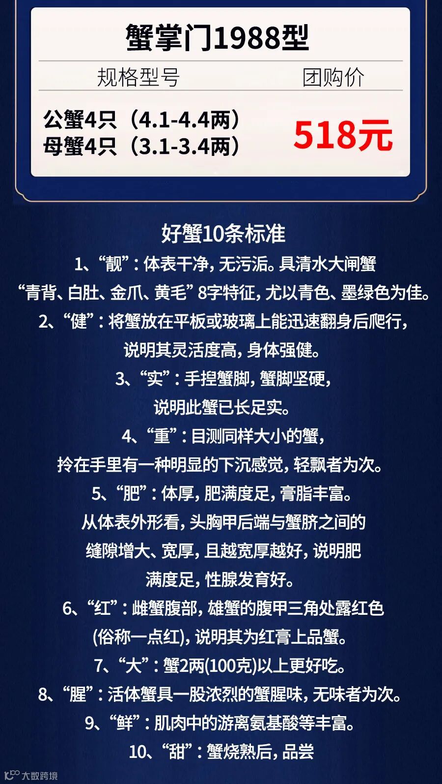 原产:溯源品质,寻觅起点,选择最优质大闸蟹原产地,在每个环节设置专人专岗进行质量把关,以直采直供深入供应链终端,把控产品品质。