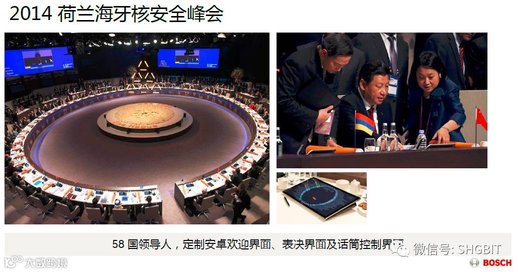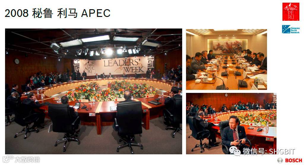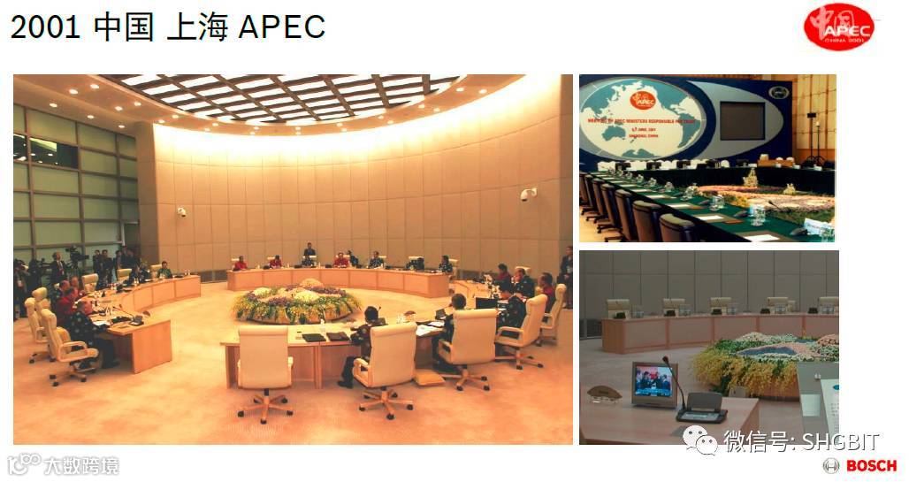 本次峰会选用博世DICENTIS有线会议系统,主会场使用36席DICENTIS多媒体设备DCNM-MMD2,配合博世高清会议摄像机,每位与会领导人均可随时了解会议进程。在相邻两个分会场共使用80席DICENTIS带触摸屏讨论设备DCNM-DE,系统间通过8台OMNEO音频接口互连,共使用了22路同声传译音频通道。