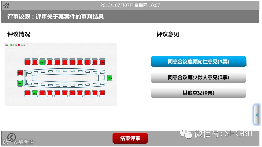 GBCOURT 审委会助理系统是一款专为法院审委会设计的专业业务助理系统。本系统在深入调研了解了法院审委会业务流程及需求的基础上,充分利用先进的计算机信息处理技术,IP多媒体网络存储及实时传输技术,触控互动式人机交互技术,有效改善了审判委员会工作,实现了审委会工作电子化、自动化和网络化,不仅有效减轻了审委会相关人员的工作负担,还有效实现了无纸化和环保节能。本系统支持案件录像回放、案件评议、资料共享、屏幕共享、案件卷宗调阅、法律法规查询、议案表决、消息通讯等审委会必备的功能。本系统采用15.6寸电容多点触摸屏,使用者只需用手指触碰显示屏就能实现对系统的操作,摆脱了键盘和鼠标繁琐的操作体验,使人机交互更为直观和便捷。