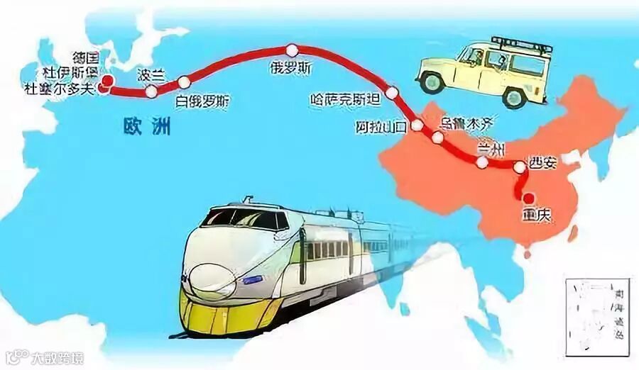 2、中国、哈萨克斯坦、俄罗斯、白俄罗斯、波兰、德国为推动国际贸易,由上述各国铁路部门联手打造了“渝新欧”国际铁路项目。该项目建设的铁路线路连接中国重庆、西安、兰州、乌鲁木齐、过境阿拉山口进入哈萨克斯坦,再经俄罗斯、白俄罗斯、波兰,终至德国杜伊斯堡,全长11179公里,被命名为“渝新欧”。其中,“渝”指中国重庆,“新”指新疆阿拉山口,“欧”指欧洲。2010年10月18日,“渝新欧”国际铁路中国国内段正式试运;2010年12月28日全程试运,由中国重庆至德国杜伊斯堡。