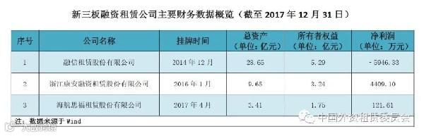 全国内资融资租赁试点企业中,有4家已在新三板挂牌,分别是融信租赁股份有限公司、浙江康安融资租赁股份有限公司、海航思福租赁股份有限公司和福建喜相逢汽车服务股份有限公司,其中福建喜相逢汽车服务股份有限公司已于2016年12月退市。(中国外资租赁委员会)