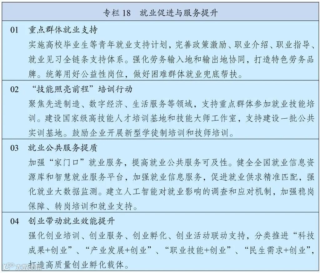 把高质量充分就业作为经济社会发展的优先目标,健全重大政策、重大项目、重大生产力布局就业影响评估机制。加强产业和就业协同,实施稳岗扩容提质行动,对外贸、建筑、住宿、餐饮等吸纳就业多的行业企业持续强化政策支持,充分挖掘服务业、新兴领域吸纳就业潜能,推动灵活就业、新就业形态健康发展。稳定和扩大高校毕业生、农民工、退役军人等重点群体就业。加强困难群体就业帮扶,促进失业人员再就业,确保零就业家庭至少一人实现就业。加大创业支持力度,增强创业带动就业效应。综合应对外部环境变化和人工智能等新技术发展对就业的影响。建立高质量充分就业评价体系。