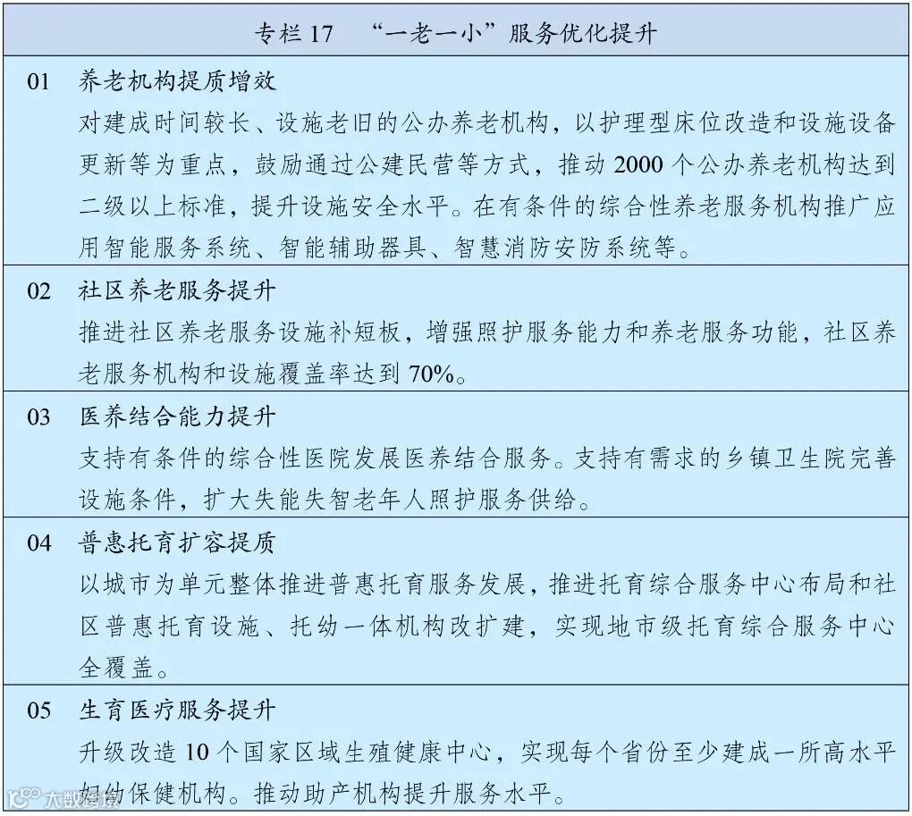 统筹规划养老服务设施布局,优化基本养老服务供给,推动养老服务扩容提质增效。深化养老服务改革发展,有序推进养老机构分类改革。发展社区嵌入式养老服务,培育专业化、品牌化、连锁化社区养老服务机构。发展家庭养老床位,推进居家适老化改造。发展互助性养老服务。健全失能失智老年人照护体系,增加养老机构护理型床位供给,积极推进医养结合。推行长期护理保险,健全统一的老年人能力评估制度。推进养老服务人员队伍职业化建设,提升养老服务综合监管质效。加强高龄独居老人和空巢老人关爱帮扶。