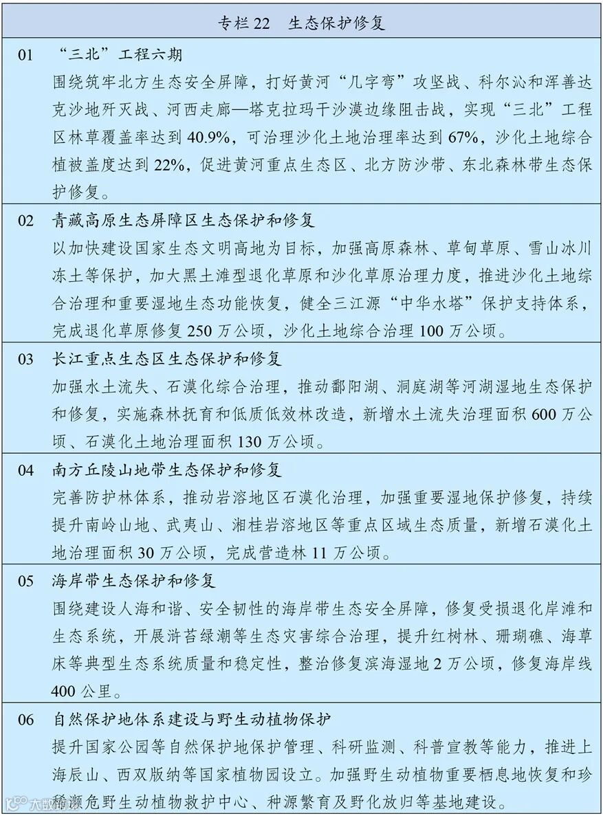 统筹推进重要生态系统保护和修复重大工程,持续巩固以“三区四带”为骨架的国家生态安全屏障体系。打好“三北”工程攻坚战,推动三大标志性战役取得决定性胜利。深入推进青藏高原生态保护,加强重点区域水土流失治理和石漠化治理。科学开展大规模国土绿化行动,推进森林质量精准提升和国家储备林建设,森林蓄积量达到224亿立方米,统筹草原生态修复与合理利用,加强湿地保护修复。推进超引地表水和超采地下水治理,开展历史遗留废弃矿山生态修复。