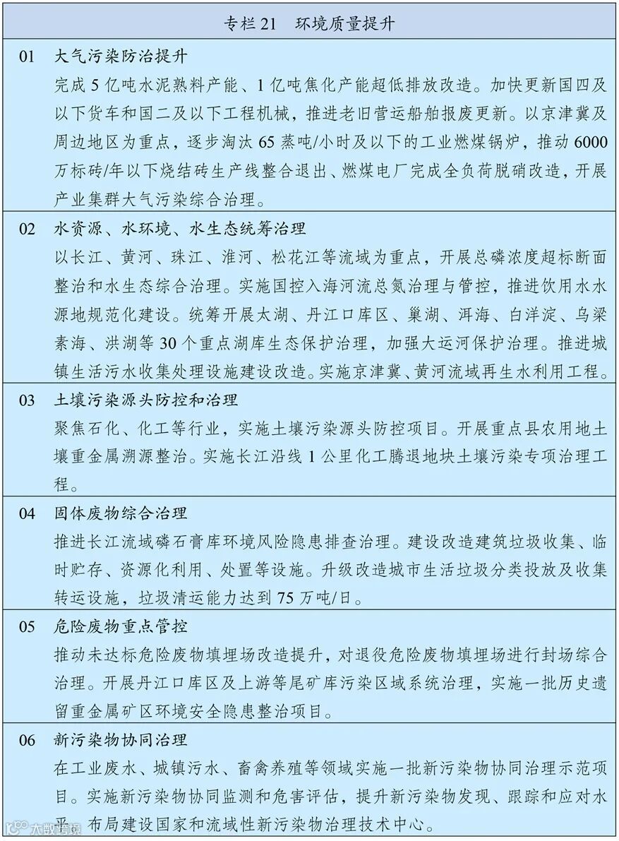 常态化管控生态环境风险,有效保障公众健康安全。实施固体废物综合治理行动,积极推进源头减量、过程管控、末端利用和全链条无害化管理,提升固体废物处置规范管控水平。强化危险废物全过程监管,重点管控重金属污染风险,开展废渣、矿山、尾矿库等历史遗留隐患排查整治。深入推进新污染物治理,建立持久性有机污染物、内分泌干扰物、抗生素、微塑料等协同治理和风险管控体系。推动核设施高标准设计、高质量建设、高水平运行,深化首堆新堆安全监管,加强老旧设施退役治理和放射性废物处置,提升辐射环境监测能力。完善跨区域、跨部门联动的突发环境事件应急响应体系。开展重点区域生态环境健康风险评估。
