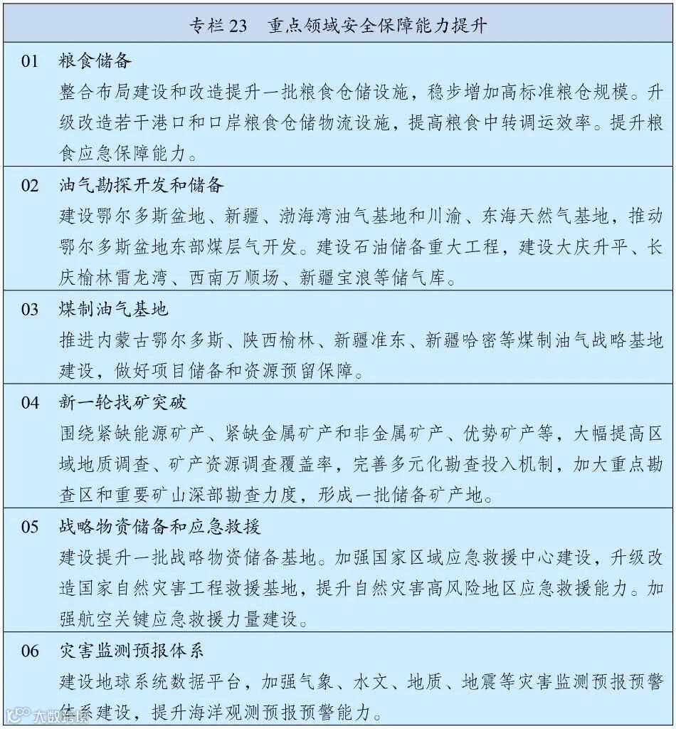 围绕实施国家发展规划,健全政策协调和工作协同机制。将国家发展规划作为宏观政策取向一致性评估的重要依据,确保各类政策发力方向符合国家发展规划要求。强化中期财政规划和年度预算安排对规划实施的财力保障,中央财政资金优先投向规划确定的重大战略任务、重大政策举措和重大工程项目。金融政策要积极支持规划确定的重点发展领域。坚持项目跟着规划走、资金和要素跟着项目走、监管跟着项目和资金走,加快规划确定的重大工程项目审批核准,优先保障规划选址、用地用海和资金需求,单体重大工程项目用地等要素需求由国家统一保障。加强对重大工程项目的伴随式穿透式监管和全过程全周期安全管理。