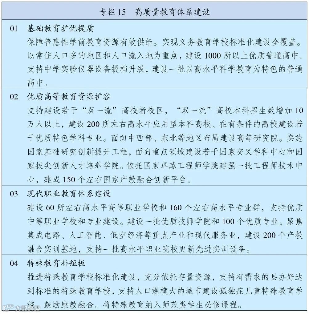 推进现代职业教育体系建设,提高职业教育办学质量和吸引力。优化与区域发展相协调、与产业布局相衔接的职业教育布局,推动专业设置紧密对接产业链创新链需求。深化中等职业教育改革,办好少而精的中等职业学校,建设特色鲜明高等职业学校,支持中高职一体化发展。建设一批高水平本科层次职业学校,推动职业教育本科与专业学位教育融合贯通。实行产教融合的人才培养模式,健全德技并修、工学结合育人机制,鼓励行业龙头企业举办或参与举办职业学校。