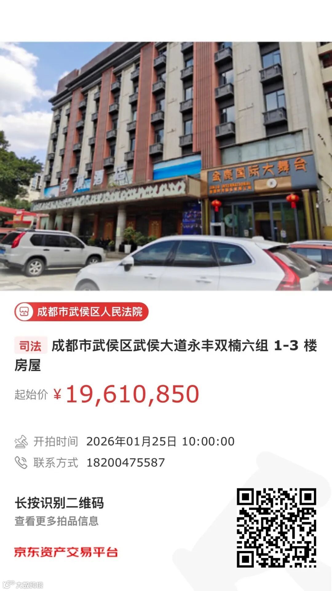 成都市武侯区人民法院将于2026年1月25日10时至2026年1月26日10时(延时的除外)在成都市武侯区人民法院京东网司法拍卖网络平台(网址:http://sifa.jd.com/3004,户名:成都市武侯区人民法院)进行第一次公开拍卖活动,可识别下图查看详情。