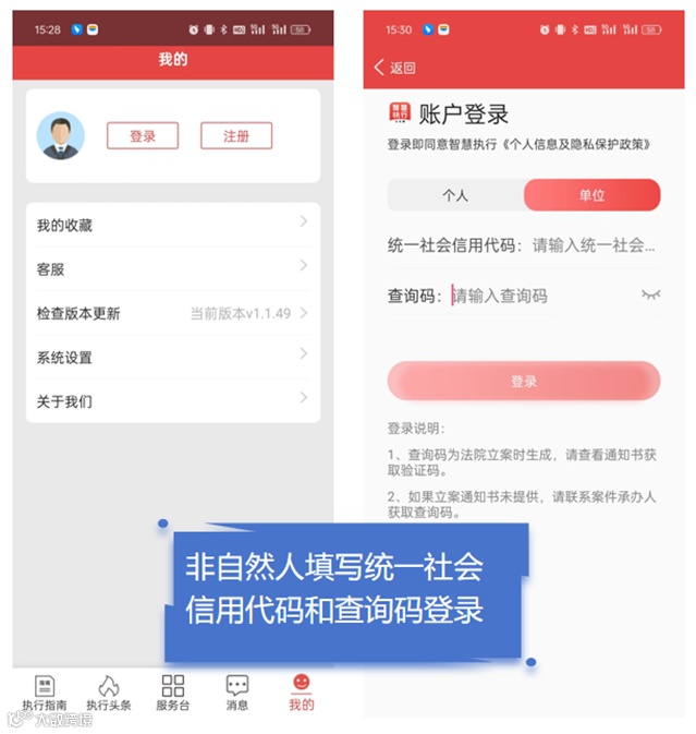 如当事人为法人,登录时需输入组织机构代码和查询码进行登录。查询码为单位用户的执行案件在法院立案时生成,单位用户可在立案通知书中查询获得案件查询码。