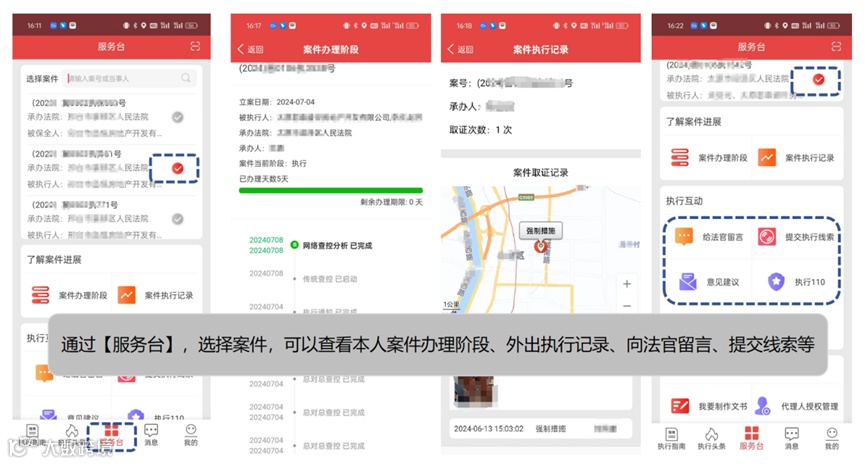 通过实名认证的自然人及登录的法人,能够通过【工作台】查看本人参与的案件,实时查看案件进展阶段,向法官留言、提供执行线索等。