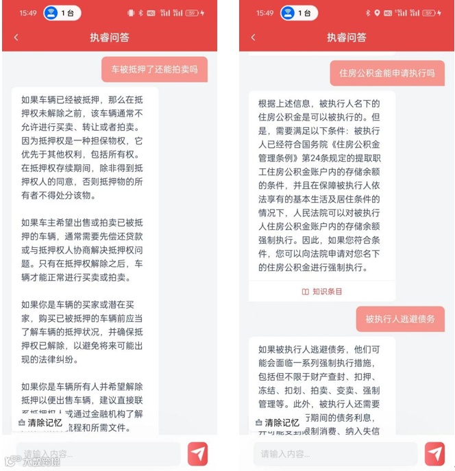 法律咨询服务采用了法律领域的AI大模型技术,非常专业和有针对性,结合专门针对执行领域的知识库,快速给出最合适的回答,问答能够用日常语言习惯提问,不止于答疑,还能对列举的案例进行情景分析,并给出建议。