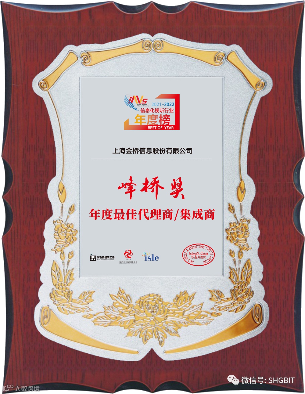 7月27日,“Best of Year 2021-2022信息化视听行业年度最佳榜”颁奖典礼以线上方式面向行业直播,信息化视听行业年度奖项也随之正式出炉。本届颁奖典礼由依马狮视听工场、isle产业研究院、isle展(国际智慧显示及系统集成展/国际标识及LED展)联合主办。经过激烈的角逐,行业专家严格严格评审,上海金桥信息股份有限公司荣获2021-2022年度信息化视听行业“Best of Year年度榜单”最佳年度代理商/集成商峰桥奖。这是对金桥包括产品研发实力、市场占有率、用户满意度等企业综合能力的高度认可。 荣誉实至名归,未来再接再厉!二十八年创业路,因情怀出发,因责任前行,因未来奋进。二十八年来金桥的发展得到了社会及行业的高度赞誉,始终致力于用科技创新打造核心竞争力,通过跨界融合赋能各类业务场景,为客户提供更科学的完整解决方案,与客户一起让未来畅想变成现实,融合行业特色,建筑数智空间。