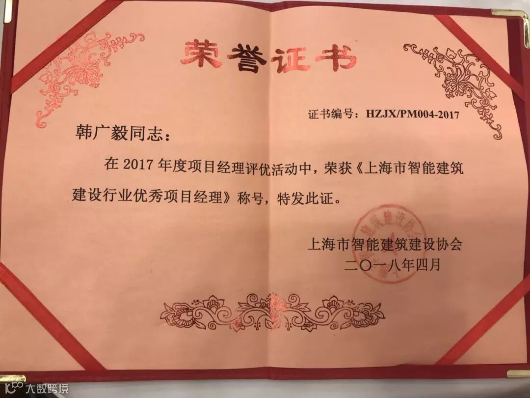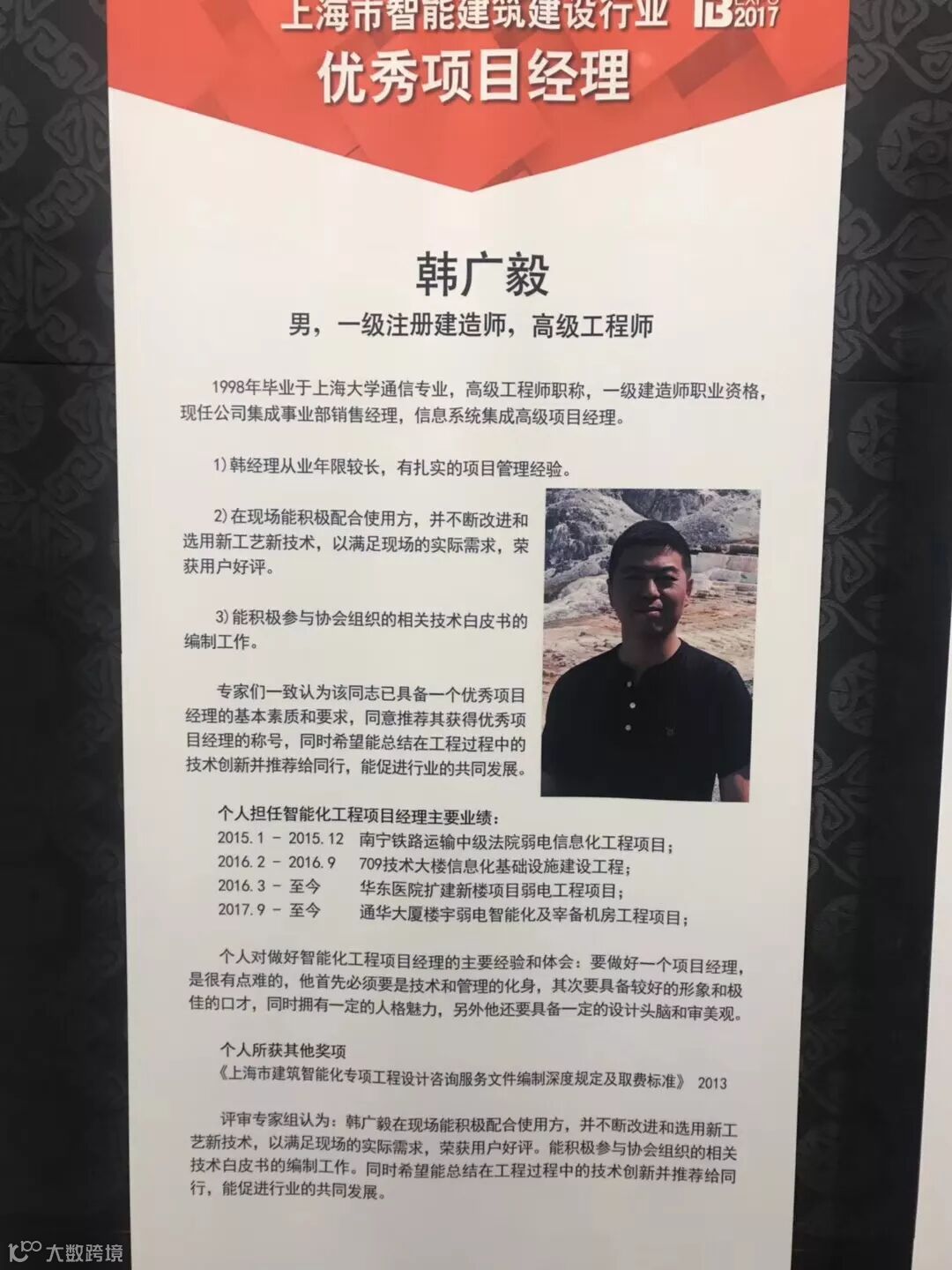 上海金桥信息股份有限公司集成事业部销售经理,信息系统集成高级项目经理韩广毅,长期从事智能建筑行业,具备深厚的技术底蕴和丰富的项目管理经验。他在智慧城市项目的建设中综合运用前沿的行业技术、创新的设计理念,带领团队打造了南宁铁路运输中级法院弱电信息化工程项目,709技术大楼信息化基础设施建设工程,华东医院扩建新楼项目弱电工程项目,通华大厦楼宇弱电智能化及宰备机房工程项目等多个业界标杆项目。在本次的评选中,韩经理脱颖而出,荣获“上海市智能建筑行业优秀项目经理”称号。