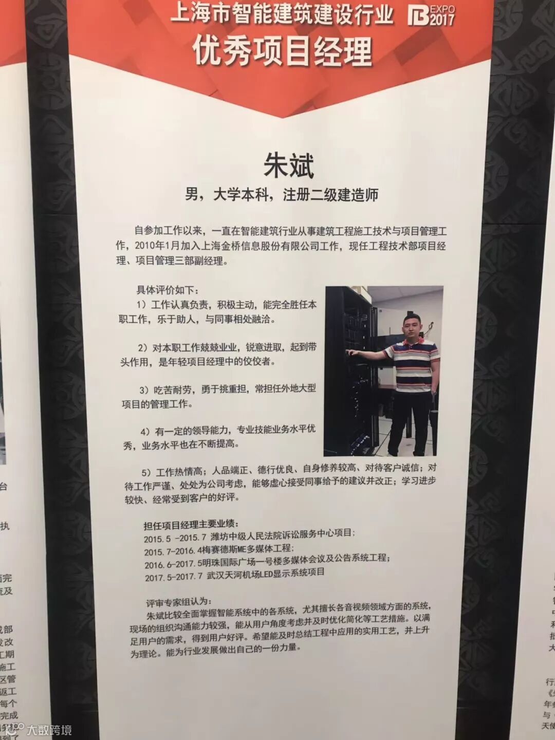 上海金桥信息股份有限公司工程技术部项目经理、项目管理三部副经理朱斌,在智能建筑行业从事拥有丰富的经验,尤其擅长各音视频领域方面的系统,担任项目经理以来,先后打造了潍坊中级人民法院诉讼服务中心项目,梅赛德斯ME多媒体工程,明珠国际广场一号楼多媒体会议及公告系统工程,武汉天河机场LED显示系统项目。在本次的评选中,朱经理脱颖而出,荣获“上海市智能建筑行业优秀项目经理”称号。