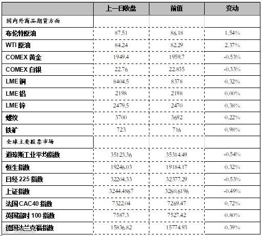 5.市场情况:Brent主力收于87.55美元/桶,前收86.17美元/桶,WTI主力84.4美元/桶,前收82.92美元/桶。Oman主力收于88.01美元/桶,前收87.21美元/桶,SC主力收于634.7元/桶,前收627.3元/桶。