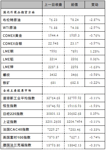 5.市场情况:Brent主力收于76.26美元/桶,前收78.36美元/桶,WTI主力71.83美元/桶,前收74.34美元/桶。Oman主力收于75.93美元/桶,前收77.83美元/桶,SC主力收于518.3元/桶,前收524元/桶。