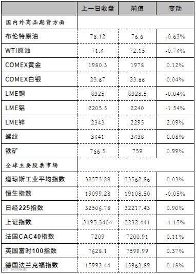 5.市场情况:Brent主力收于76.29美元/桶,前收76.71美元/桶,WTI主力71.74美元/桶,前收71.74美元/桶。Oman主力收于75.12美元/桶,前收75.89美元/桶,SC主力收于525.6元/桶,前收526.5元/桶。