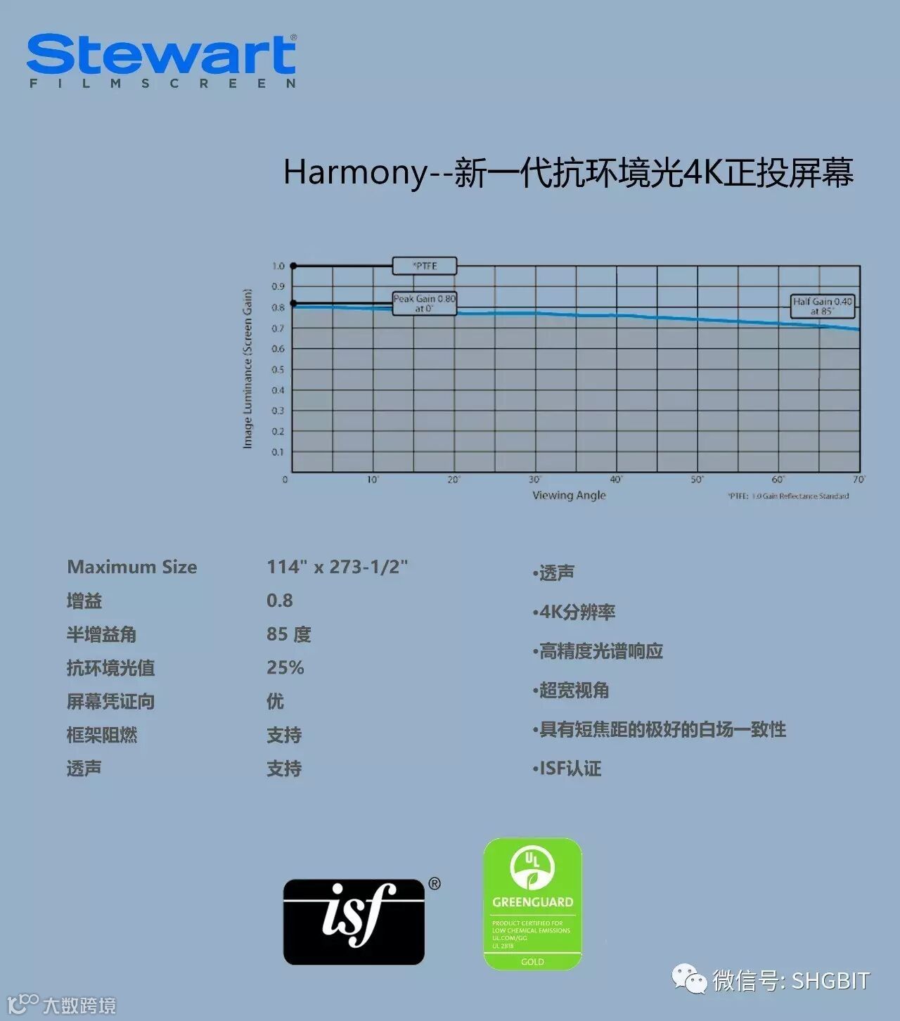 灯光可控的环境是使用Harmony最理想的场所。170度观看视角,Harmony可适合几乎任何座位排列模式。表面平整的光谱响应曲线,保证颜色与肤色的高度逼真与准确度。Harmony不透明黑色背衬屏幕消除了由于光线从墙壁反射到屏幕的潜在干扰,屏幕设计达到4K+分辨率,这使得它适用于所有投影机及应用,具备最理想的声学透明度。增益为0.8,可以与投影仪急房间环境一起使用。