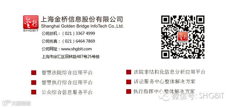 上海金桥信息在法院项目上耕耘多年,对法院项目有着独到的见解、深刻的领悟和全面的感知,凭借着这一卓越优势,金桥人用先进的技术、周到的服务一直为中国法院事业默默贡献着自己的一份力量,我们有理由相信金桥信息在未来法院项目上将取得更大的成就。金桥信息从 2000 年开始从事法院信息化建设、在智慧法院大楼总集成、法官服务平台,法院大数据分析应用平台,司法公开平台、信息集控中心、执行指挥中心等领域积累了广泛经验和丰富的技术专利。金桥信息法院案例覆盖面较广,从最高院到各地方法院均有众多成功案例。金桥信息注重在法院行业的优质服务,多年来一直为最高院,部分省市高院以及基层院提供优质的驻场维护服务。金桥信息对于重大法院活动提供专业的保障工作。未来几年,金桥信息将着重在法院信息化领域进行探索和服务,励志成为国内首屈一指的法院信息化服务集成商。