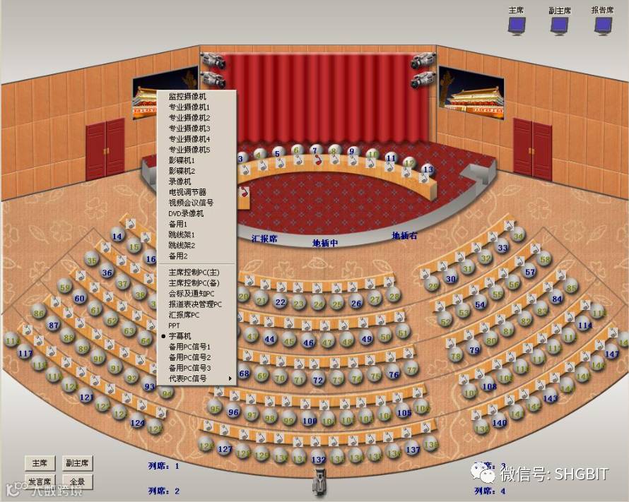 (2) 会中可与现有的签到系统和表决系统对接,实现实时报到管理和表决管理功能;可对议政厅会务设备进行可视化集中控制管理功能:大屏图像显示模式切换、主席台图像跟随处理、发言话筒人工/自动控制管理、音频调节、信号调配、电源管理等;