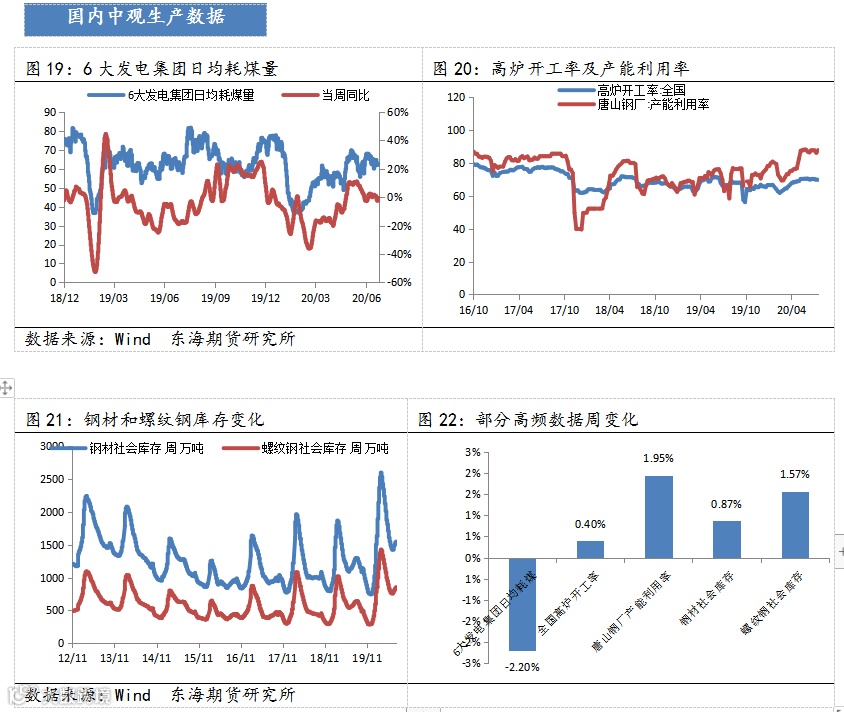 从中观生产来看,工业生产整体表现较为稳定。上周全国高炉开工率小幅回升,钢材产量增速恢复正增长,六大电厂日均发电耗煤持续回落,钢材库存出现积累。7月前三周35城地产销量增速与6月基本持平,中汽协、乘联会乘用车销量增速较6月有所回升。关注洪涝灾害及高温天气对需求端的影响,叠加外围不确定性上升,避险情绪升温,或对大宗商品走势形成利空。