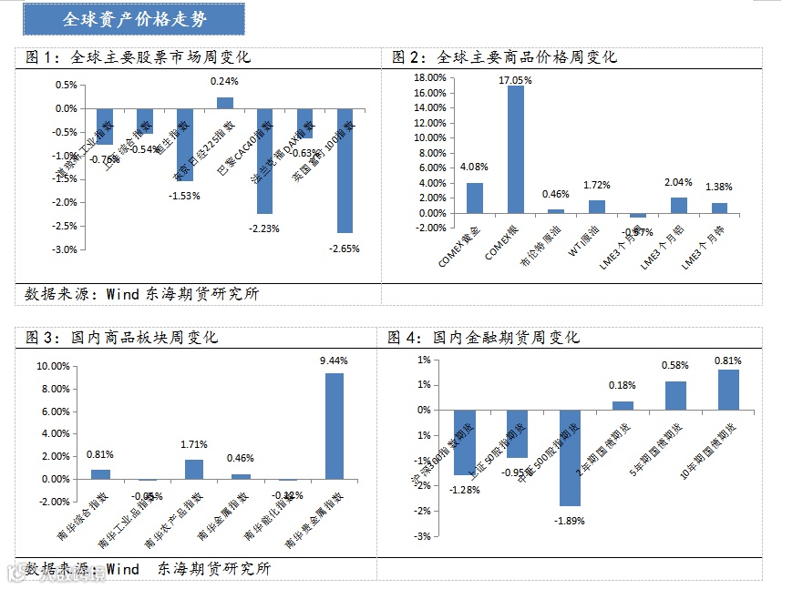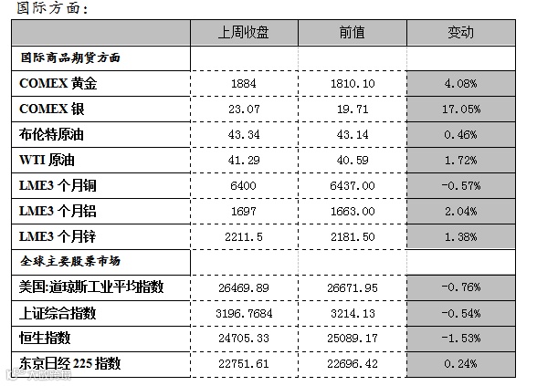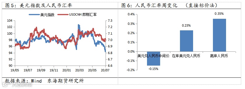上周,中方宣布关闭美国驻成都总领事馆,此前美国要求中方关闭中方驻休斯顿总领事馆。叠加国内疫情再次出现反复,市场风险偏好下降,周期类大宗商品价格或将面临回调。需密切关注两国就领事馆事件的表态及进一步的动作,如果形势缓和,那么大宗商品或延续上涨。如果形势出现升级,全球风险偏好恶化,市场或将面临进一步下跌,金银价格仍有上涨动力。