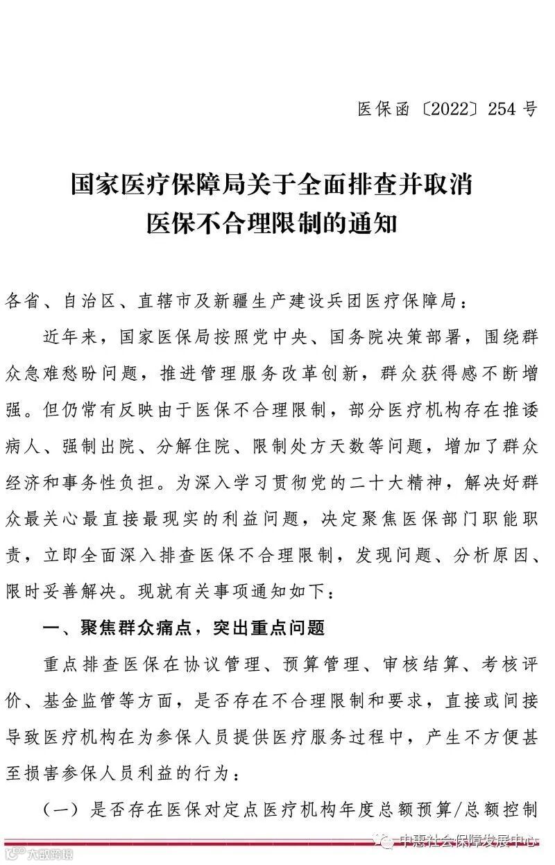 国家医疗保障局关于全面排查并取消医保不合理限制的通知 社保金融发展论坛