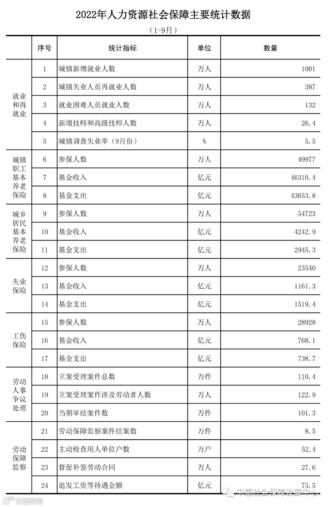 2022年1-9月人社主要统计数据